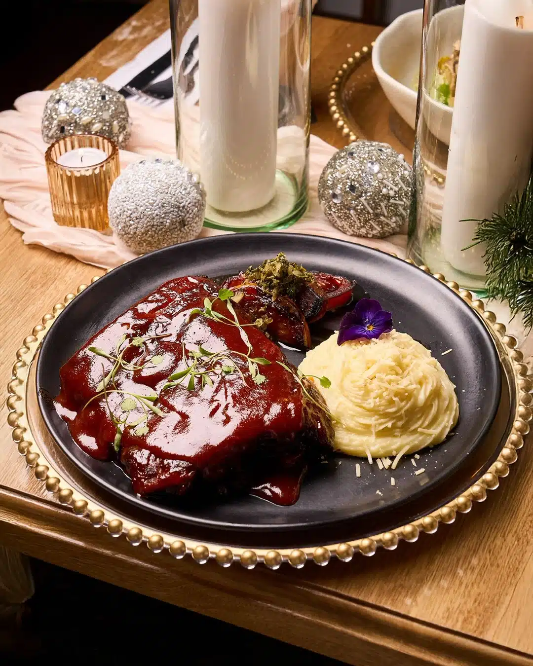 Nuestras Costillas Arrebatadas, son bañadas en salsa bbq o miel mostaza, flameadas con ron, acompañadas de tomates parrillados, puré de la casa o papas a la francesa.