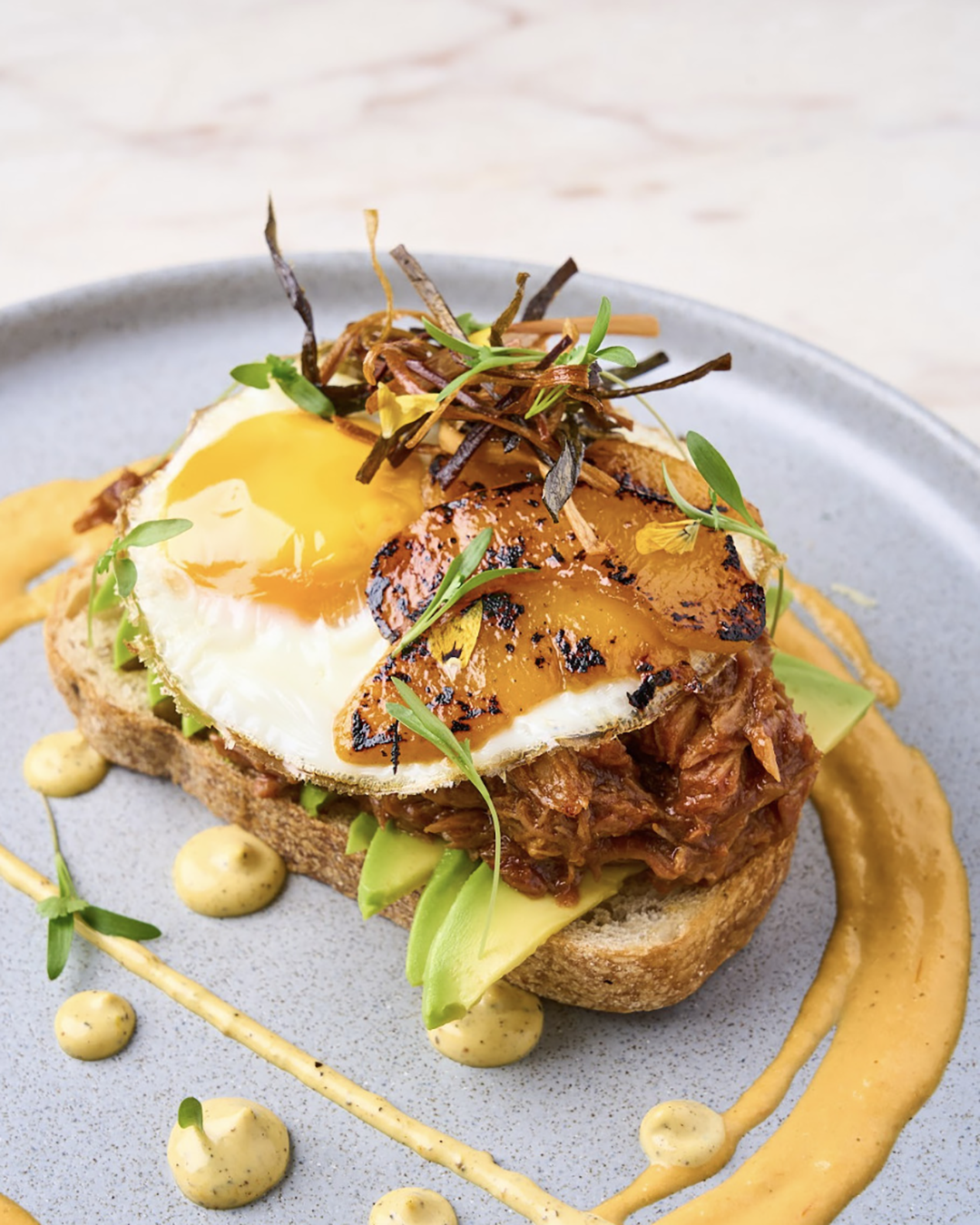 Pan artesanal de masa madre, costilla de cerdo ahumada, duraznos glaseados, crocantes de puerro caramelizado y huevo frito.