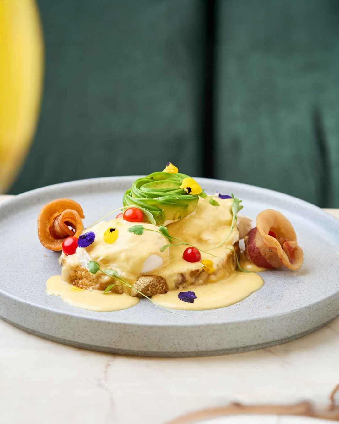 Pan de masa madre y tres opciones de huevo para escoger (Poché, frito o revuelto) tocineta y aguacate.