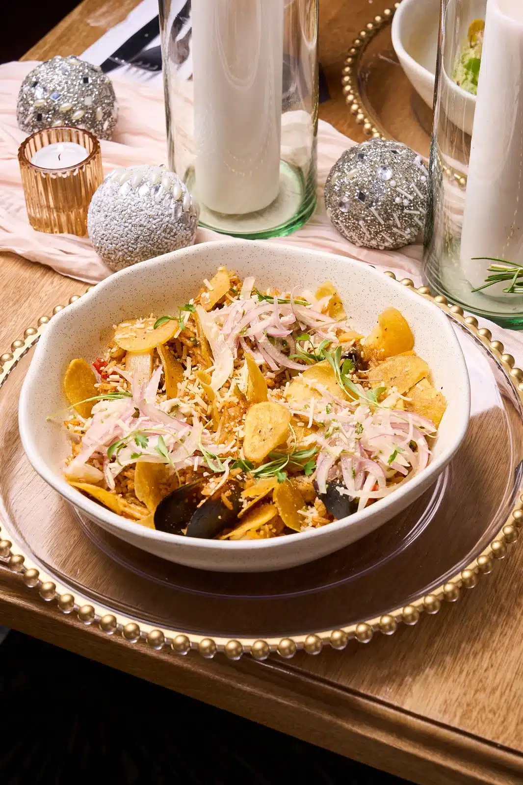 Arroz Mediterrano, con mariscos en pasta de pimentón ahumado, vegetales y chips crocantes de plátano, acompañado de leche de tigre.