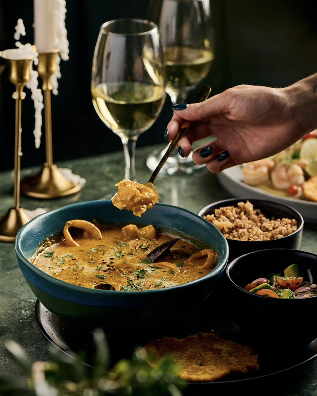 Cazuela al estilo Malanga, mariscos saltados en bísquet, acompañados de arroz con coco y crocantes de plátano.