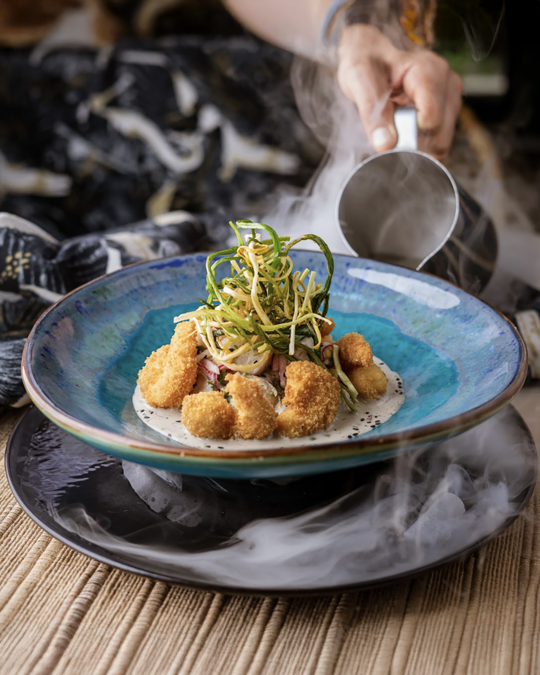 Cubos de pesca blanca en una cremosa leche de tigre en salsa de trufa. Acompañado de camarones crocantes y un topping de puerro crocante.