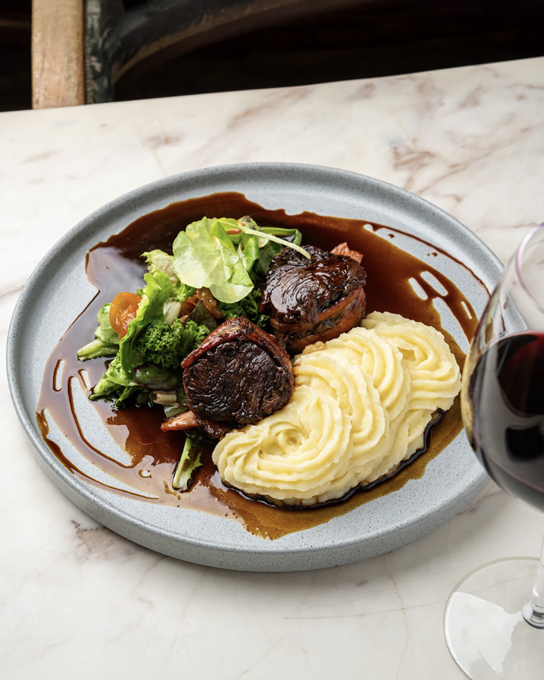 Lomo enrollado con tocineta ahumada, bañado con salsa de café, acompañado de ensalada fresca y puré de papa a la parmesana.