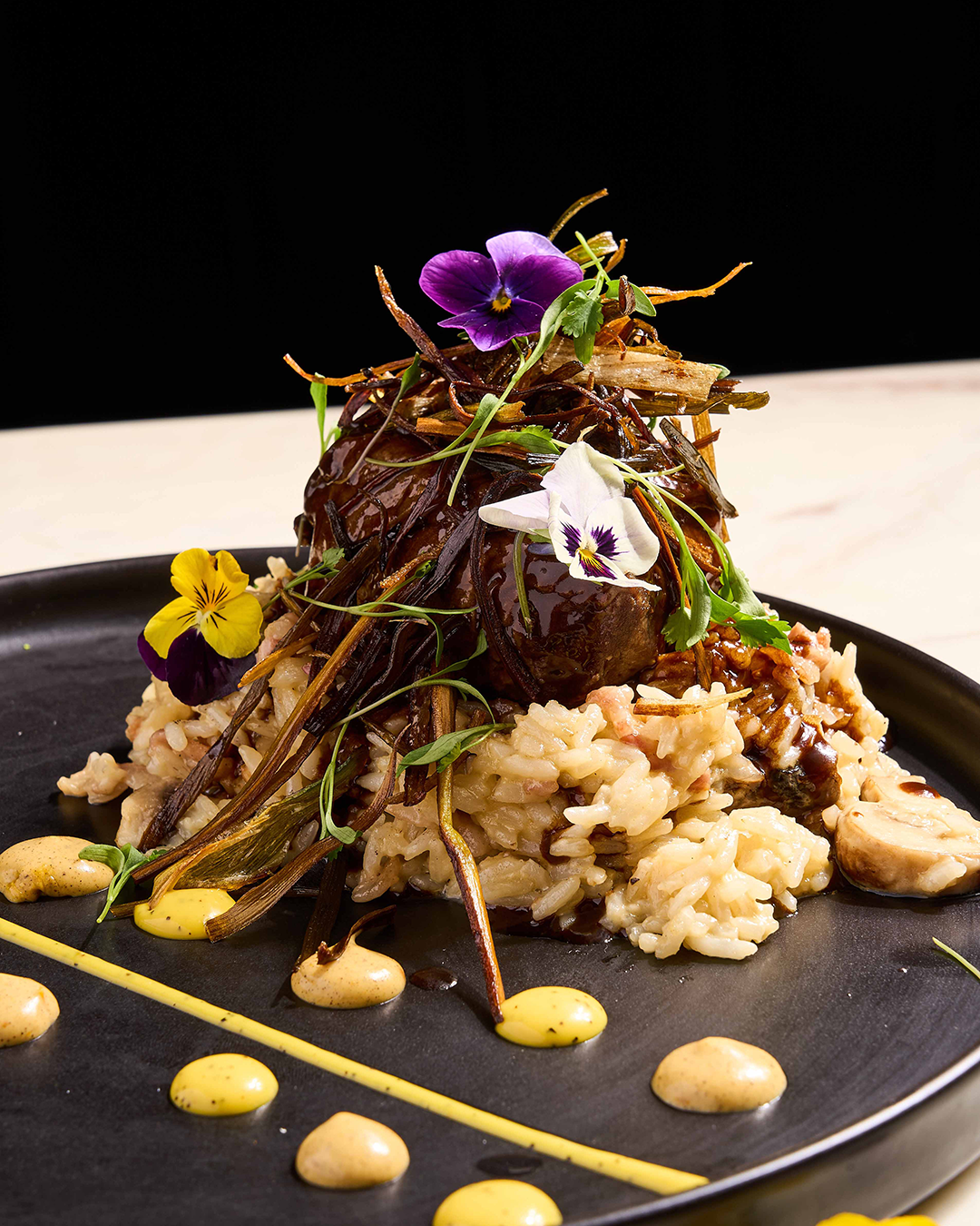 Solomito en salsa cremosa de soya sobre una base de arroz con tocineta, champiñón y topping de puerro crocante.