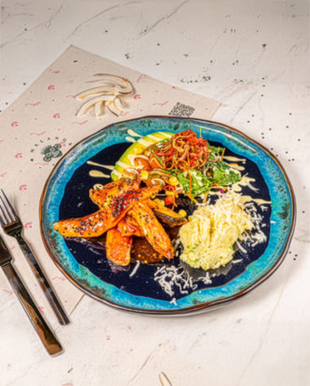 Filete de salmón a la plancha bañado en salsa agridulce, acompañado de ensalada fresca, con aguacate y puré de papas.